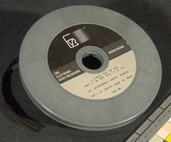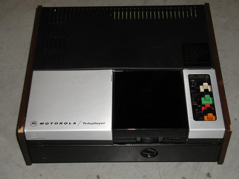 Pero el prototipo que más me ha llamado la atención es el propuesto por la empresa norteamericana CBS, el Electronic Video Recording (EVR), tanto por su aspecto francamente tosco, como por su condición de híbrido entre el cinematógrafo y el vídeo doméstico. Como se puede ver en la foto de arriba, no se trataba de un modelo de casete más o menos evolucionado, sino de un auténtico rollo de película fotográfica que, por tanto, solo podía reproducir programas ya grabados a partir de otros formatos, no grabar directamente la señal de la televisión. La película, que solo duraba 50 minutos –25 en cada una de sus dos pistas paralelas–, tenía un tamaño similar al Super 8 –en concreto 8,75 mm–, pero era más resistente y carecía de perforaciones. A su paso por el reproductor, la cinta se escaneaba para convertir sus imágenes fotográficas en señales electrónicas aptas para ser emitidas por el televisor.