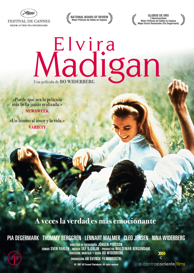 Elvira Madigan (Bo Widerberg, 1967): En la Suecia de finales del siglo XIX, una joven equilibrista y un oficial del ejército abandonan sus vidas –él tiene mujer y dos hijos– para entregarse al amor libre. Sin embargo, como la pasión no da de comer, su ruptura de las normas sociales les conducirá hacia un callejón sin salida. Su bella fotografía paisajística y su insistente música –de Mozart– sirven para ahondar en un romanticismo de apariencia naíf algo insulso, pero coherente con el contexto hippie en que se produjo la película. Estos trágicos amantes, que incluso comen flores, son así unos inconscientes precursores del movimiento.