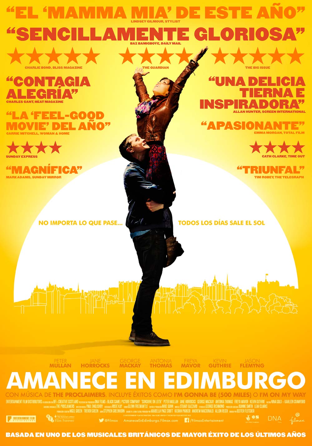 Amanece en Edimburgo (Sunshine on Leith) (Dexter Fletcher, 2013): Recolectar un puñado de canciones de un grupo muy popular y acoplar el guion a sus letras es un procedimiento muy común en el teatro musical contemporáneo que a veces desemboca en el cine, como sucedió con ABBA o The Beatles. En esta ocasión se trata de The Proclaimers, un grupo de pop-folk escocés cuyos melifluos temas han conducido a una bobalicona comedia romántica en el marco de una Edimburgo embellecida para beneficio de su industria turística. En realidad, todo esto se podría perdonar si los números musicales tuvieran garra o cierto estilo. Pero no lo tienen.