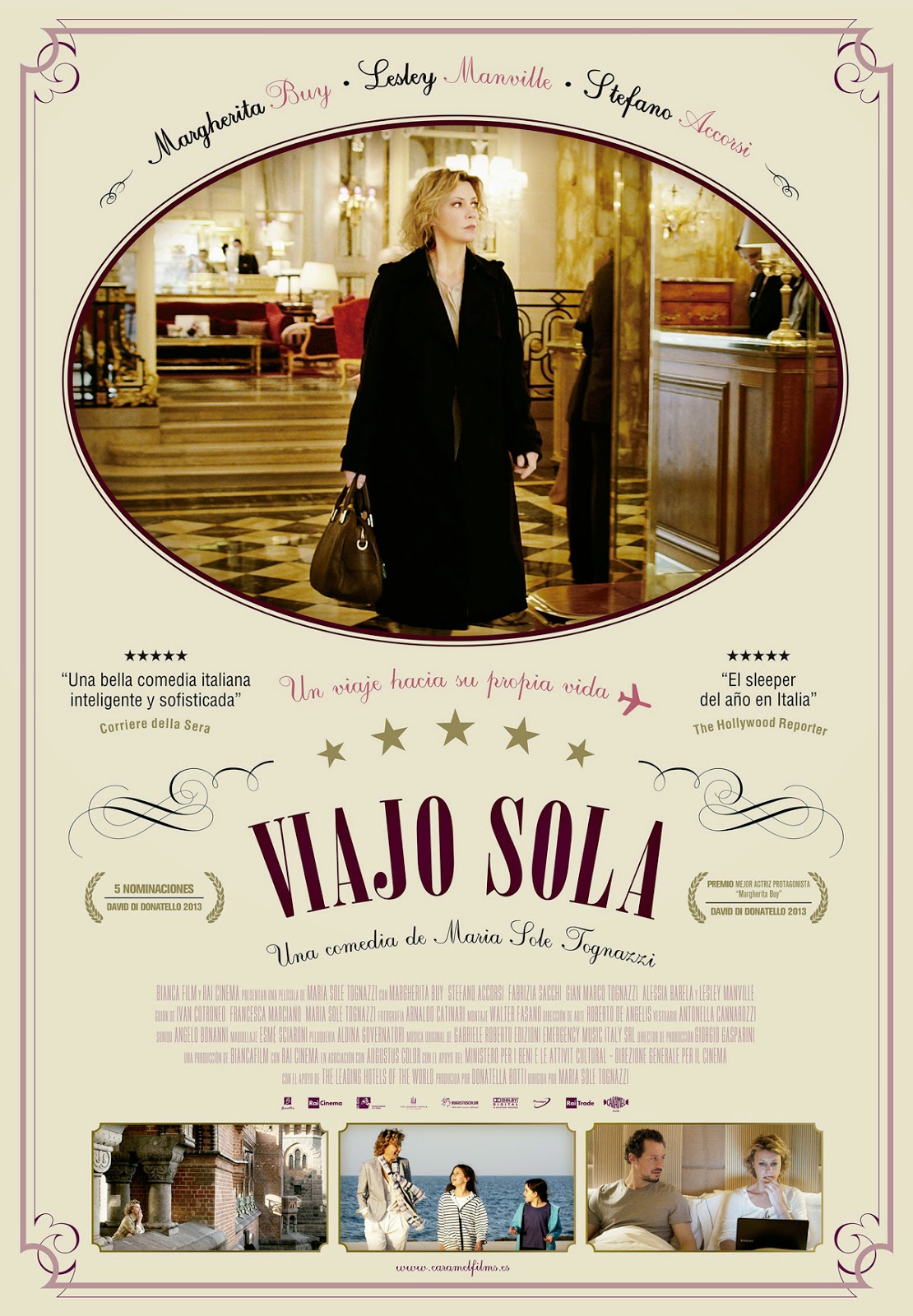 Viajo sola (Viaggio sola) (Maria Sole Tognazzi, 2013): Una mujer madura y soltera trabaja de incógnito por todo el mundo como inspectora de hoteles de lujo. Sin duda, es un trabajo envidiable, pero no le ha permitido tener una pareja estable o una familia “normal” como la de su hermana. No se arrepiente de una opción vital tomada a contracorriente de la presión social, pero tampoco está libre de dudas. Su actriz –Margherita Buy– transmite su desconcierto convincentemente, sin dramatizar en exceso, por lo que esta amable película se ve sin dificultad, pero también se olvida tan pronto como uno sale del cine.