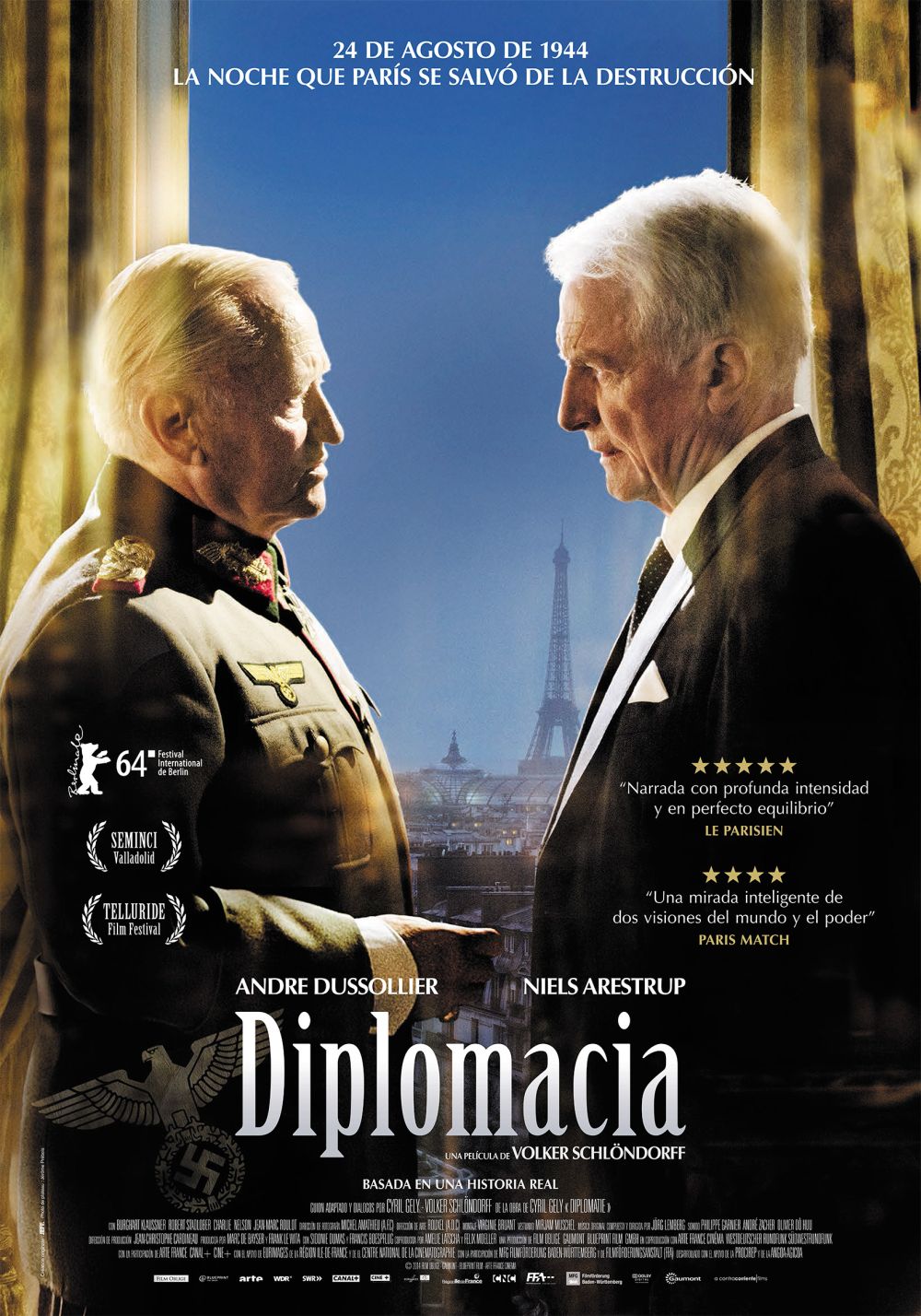 Diplomacia (Diplomatie) (Volker Schlöndorff, 2014): Agosto de 1944. Los nazis están a punto de perder París, pero Hitler ha planeado la destrucción total de la ciudad antes de que eso suceda. El general que debe cumplir la orden y el diplomático sueco que pretende disuadirle de que la cumpla establecen un duelo dialéctico apasionante. No hay suspense sobre el resultado final, bien conocido por todos, pero la mano maestra de Schlöndorff consigue difuminar el origen teatral del guion y transmitir la tensión que origina un dilema moral de difícil solución. Todo ello apoyado, además, en dos grandes actores: Niels Arestrup y André Dussollier.