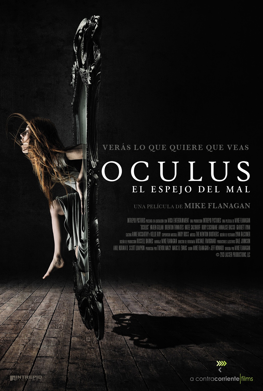 Oculus: El espejo del mal (Oculus) (Mike Flanagan, 2013): Debido a la maléfica influencia de un tétrico espejo, dos jóvenes hermanos perdieron a sus padres cuando eran niños. Ya adultos, el chico sale libre de un psiquiátrico y se une a su hermana para intentar destruirlo, lo que no será nada fácil por las visiones que provoca cuando se cae en su campo de influencia. Aunque la película arriesga narrativamente entrelazando los dos planos temporales de la historia dentro de algunas secuencias, en realidad su contenido es tan manido y sus personajes tienen tan poca profundidad que pronto acecha el aburrimiento, más que el miedo, en el espectador.