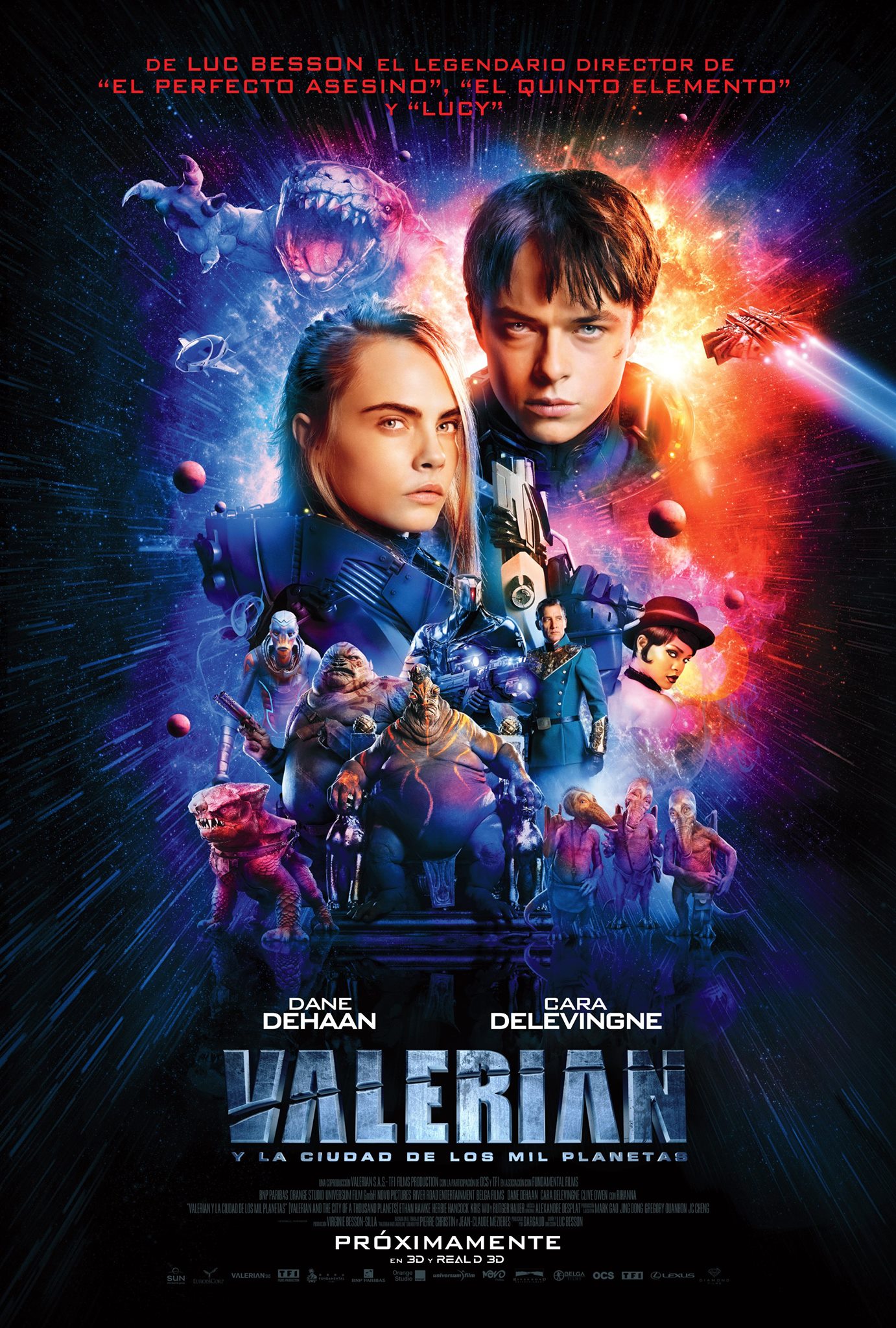 Valerian y la ciudad de los mil planetas (Valerian and the City of the Thousand Planets) (Luc Besson, 2017): Hasta ocho países de tres continentes participan en la producción de este film de aventuras espaciales en el que es imposible distinguir alguna singularidad que revele la procedencia francesa del tebeo original, pues se trata de competir en todos los mercados del único planeta al que tenemos, por ahora, acceso. Para ello es mucho mejor realizar sin pudor una buena mezcla de otros films anteriores, de La guerra de las galaxias a Avatar, que encontrar un nuevo camino. Pese a esto, su buen medido montaje y su espectacular fuerza visual consiguen que nos mantenga interesados durante sus 137 minutos.