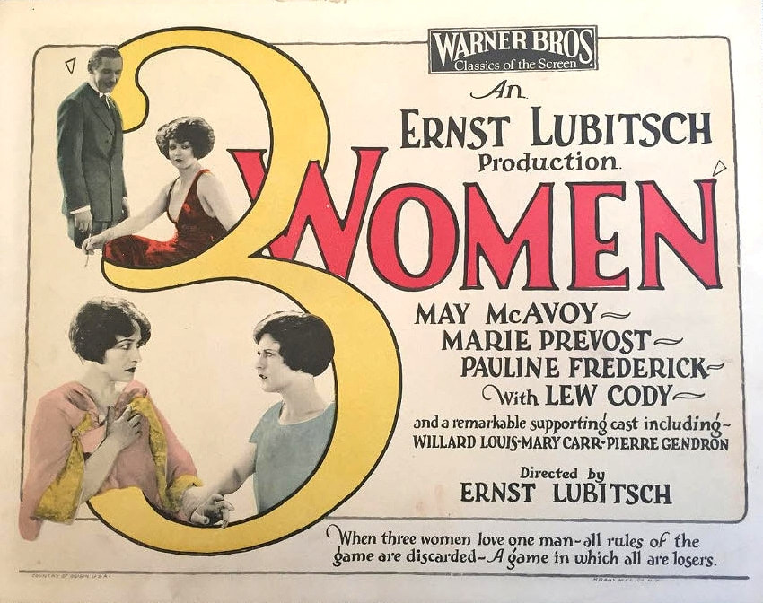 Mujer… guarda tu corazón (Three Women) (Ernst Lubitsch, 1924): Después de debutar en el cine norteamericano con dos espléndidas comedias, Lubitsch abordó un melodrama que, a juzgar por el resultado en esta película y por su carrera posterior, no es el género que mejor dominaba. Una mujer millonaria padece los primeros estragos de la edad: las arrugas y el sobrepeso. Incapaz de afrontar la realidad, acepta el galanteo de un cazafortunas endeudado sin preguntarse los motivos de su repentino interés. Todo se complica cuando aparece su hija de 18 años y el hombre también se interesa por ella. Es lógico desde la perspectiva de él, pero el espectador nunca comprenderá qué han visto en él las dos mujeres, pues no es joven, ni guapo, ni tiene dinero. Es un fallo argumental que pesa durante toda la narración y que la aparición del pretendiente de la joven no consigue paliar, por ser un personaje insustancial. No se puede decir que no esté bien rodada, pero le falta la picardía de sus comedias y carece de ambigüedades interesantes. Incluso tiene un tono moralizante que molesta un poco. Por lo demás, no comprendemos por qué se titula Tres mujeres en el original, pues no hay una tercera con un papel destacado.
