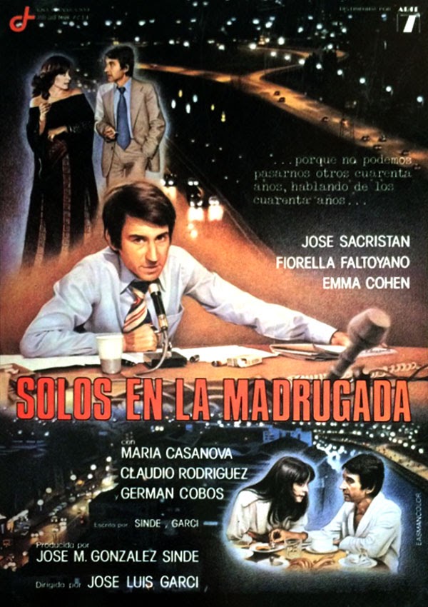 Solos en la madrugada (José Luis Garci, 1978): En su exitoso debut, Asignatura pendiente (1977), Garci ya apuntaba a cierto desencanto con los nuevos vientos políticos tras la dictadura. Al año siguiente, cuando ya había habido elecciones democráticas, pero todavía no se había aprobado la Constitución, su protagonista, de nuevo interpretado por José Sacristán, toma la palabra para arengar a los españoles de su generación. Como si de una película de autoayuda se tratara, su personaje, que tiene un programa nocturno de radio, expresa los temores de un hombre de mediana edad educado en unos valores que están siendo superados rápidamente, como descubre cuando es seducido por una joven más moderna que él. La interrelación entre el ambiente político y la intimidad de los personajes no está tan bien conseguida como en su anterior cinta porque usa y abusa de la palabra. Ciertamente, es otro testimonio sociológico de la época muy interesante, pero cinematográficamente se resiente de sus excesivos parlamentos. La relación con su ex mujer, también interpretada por Fiorella Faltoyano, carece de la fuerza emotiva esperada. El eslogan “porque no podemos pasarnos otros cuarenta años hablando de los cuarenta años…” parece profético vista nuestra actualidad política. Seguimos dando vueltas a un pasado nunca superado del todo.