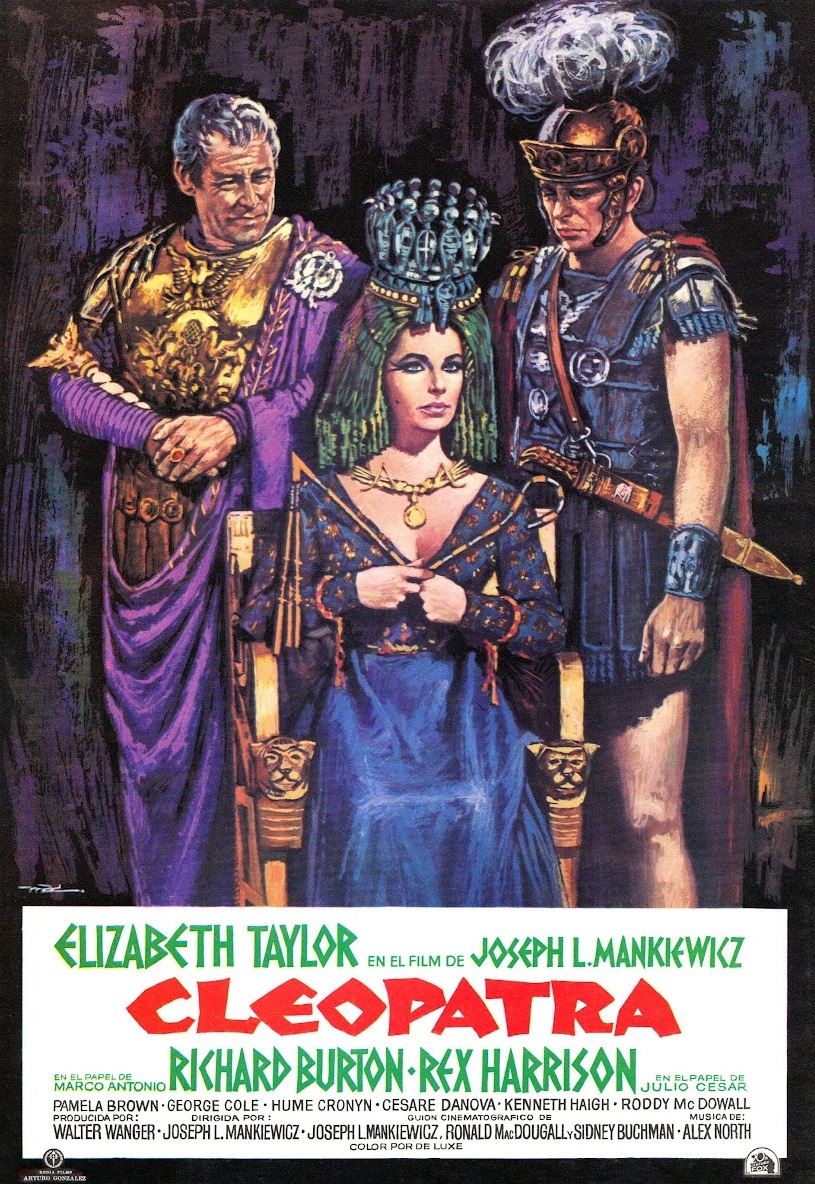 Cleopatra (Joseph L. Mankiewicz): Este seguramente sea el mayor fracaso de la historia de Hollywood debido a un coste superlativo que fue imposible de recuperar en la taquilla. Pero aparte de su disparatado esfuerzo de producción, reflejado en sus espectaculares imágenes de la Roma y el Egipto antiguos, con sus enormes decorados interiores y exteriores, su fracaso debemos explicarlo principalmente por su pesada narrativa. En sus más de cuatro horas se relata la relación de Cleopatra con Julio César primero y, tras la muerte de este, con Marco Antonio, entrelazándose las conveniencias políticas con los sentimientos amorosos. Este armatoste histórico nunca consigue desprenderse de la rigidez escénica de su puesta en escena, encontrando sus mejores bazas en las escenas más íntimas, paradójicamente. La escenografía resulta demasiado acartonada y kitsch, inasumible para un espectador moderno, pero en ella se mueven personajes con verdadera entidad gracias a sus magníficos diálogos y a unos intérpretes con verdadero magnetismo como Richard Buton y Elizabeth Taylor. Son destellos de gran cine en medio de una película demasiado densa que avanza a trompicones, con elipsis tan bruscas que hacen pensar que hay metraje fundamental para su adecuado ritmo que fue recortado para no excederse todavía más.